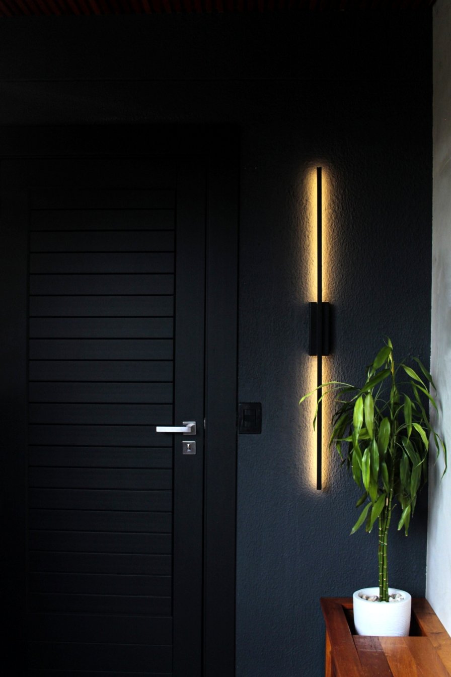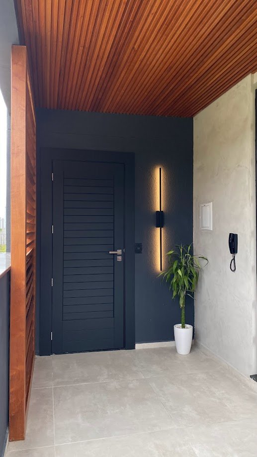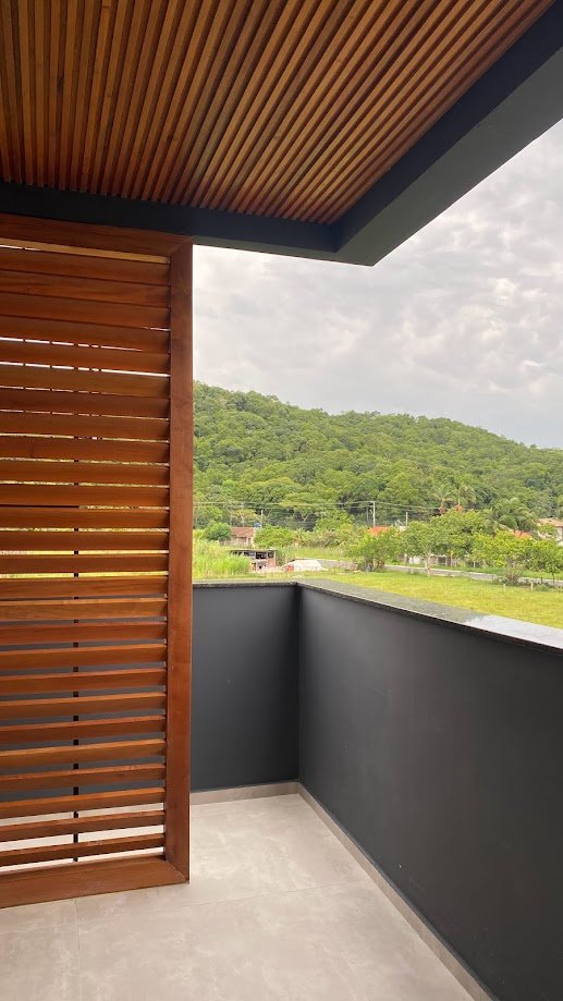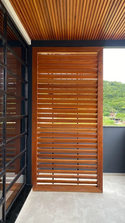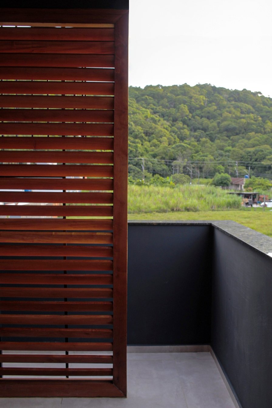 Um desafio desse projeto foi incorporar à fachada uma composição harmônica que também correspondesse ao ambiente interno. A utilização da madeira foi fundamental para isso. Foram projetados elementos vazados para cumprirem as funções e estética desejada, além de um lindo forro ripado. Uma estratégia linda e aconchegante.