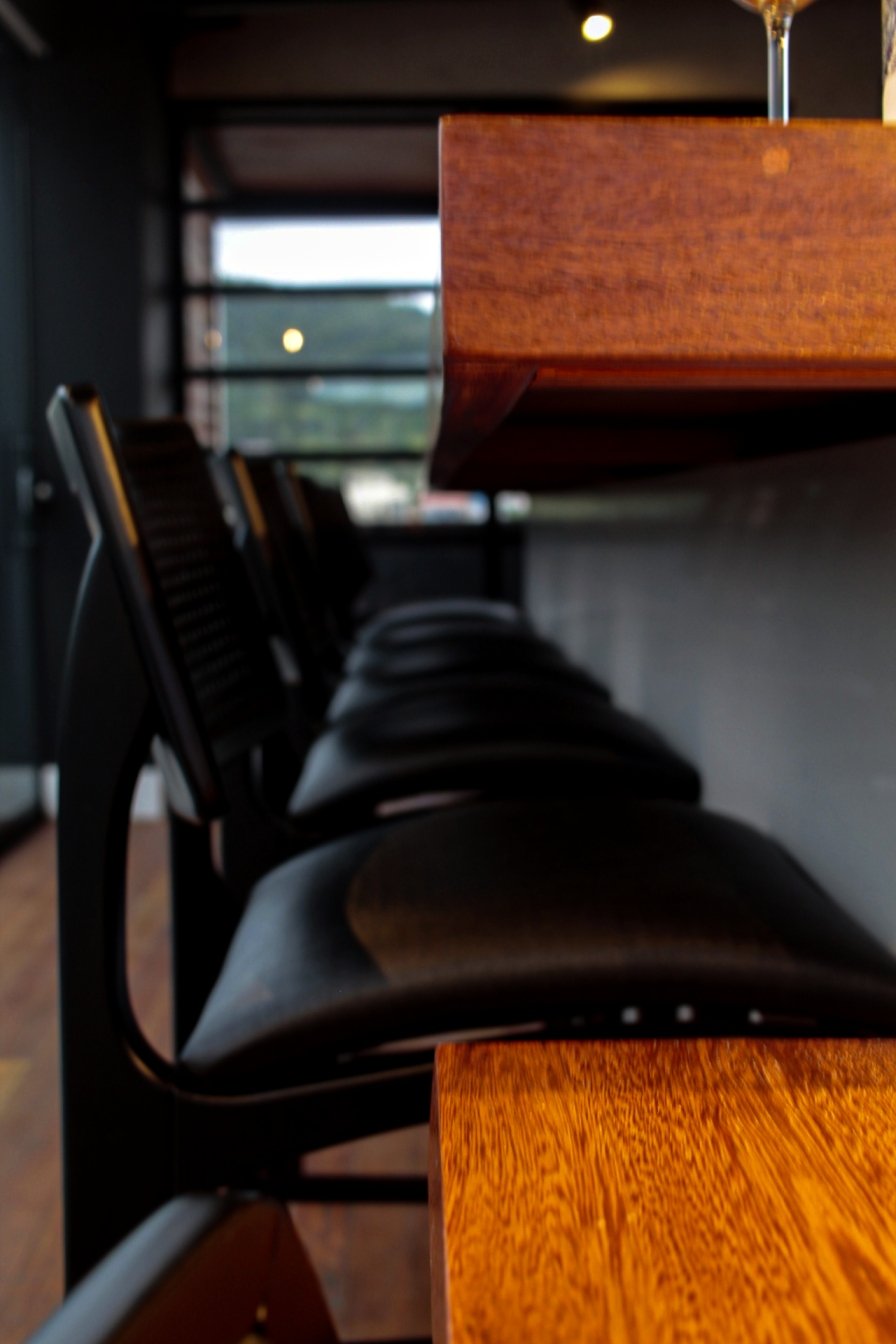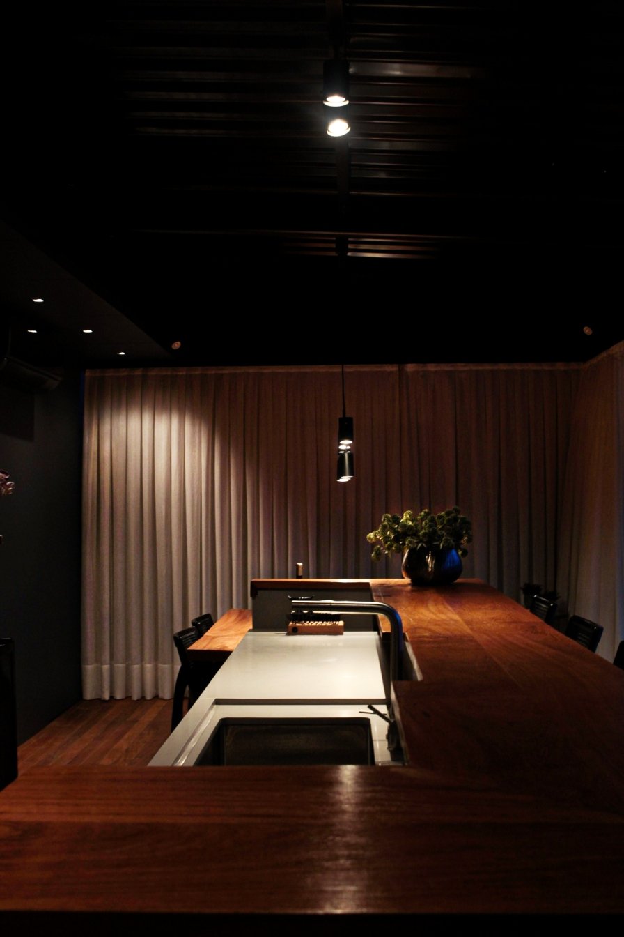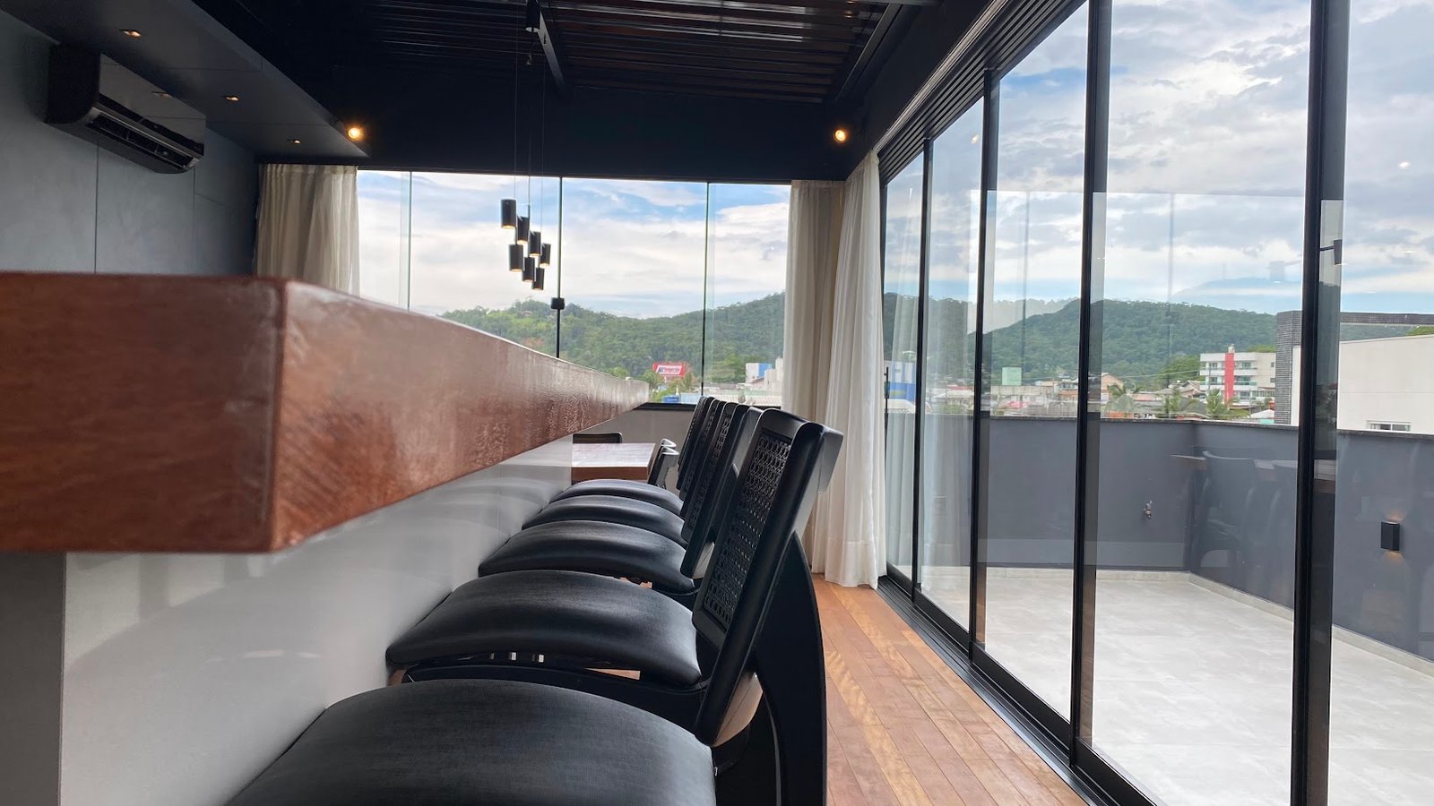 Um desafio desse projeto foi incorporar à fachada uma composição harmônica que também correspondesse ao ambiente interno. A utilização da madeira foi fundamental para isso. Foram projetados elementos vazados para cumprirem as funções e estética desejada, além de um lindo forro ripado. Uma estratégia linda e aconchegante.